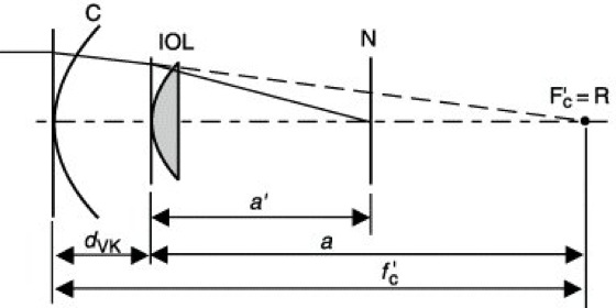 Ausgangspunkt der Berechnungen ist der Brechwert des aphaken Auges. Er entspricht dem des Hornhautsystems und beträgt gemäß dem Gullstrand-AugeDC=43,05 dpt. Aus diesem Wert sowie der Augenlänge l=24 mm, der Brechzahl der intraokularen Flüssigkeit (Kammerwasser und Glaskörper) mit n=n'=1,336 kann man die FernpunktrefraktionAR=11,66 dpt des aphaken Auges berechnen (Aphakie).