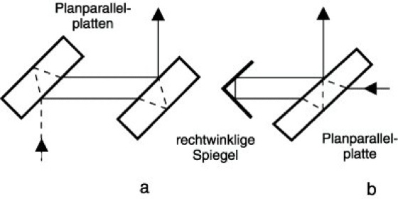 Jamin-Interferometer, Bezeichnung für ein aus der Brewsterschen Interferenzanordnung (Brewstersche Streifen) hervorgegangenes Interferometer. Die Interferenzen entstehen durch Aufspaltung und Wiedervereinigung eines Strahles durch Reflexion an Vorder- und Hinterfläche zweier planparalleler Glasplatten gleicher Dicke, die um einen geringen Winkel gegeneinander geneigt sind (Abb., a). Es gibt auch eine Modifikation mit nur einer Planparallelplatte (Abb., b). Die Interferenzfigur besteht aus geraden Streifen im Unendlichen. Mit keilförmigen Platten lassen sich Interferenzen im Endlichen erzeugen. Das J. wird als Interferenzrefraktometer zur Bestimmung von Unterschieden im Brechungsindex von Gasen und Flüssigkeiten oder als Interferenzmikroskop verwendet.