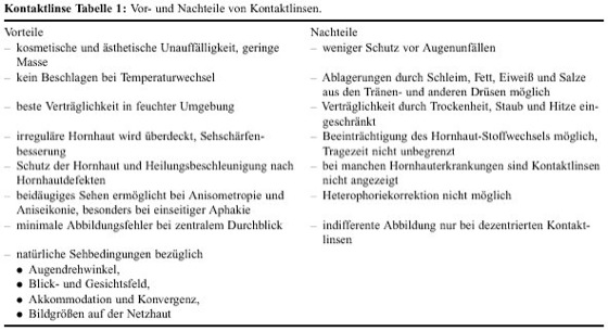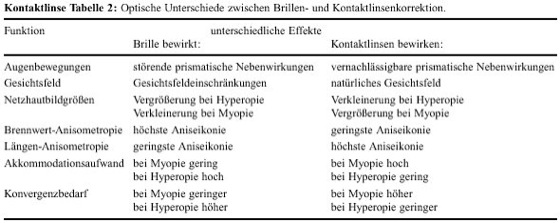 Die Vor- und Nachteile werden in Tabelle 1 gezeigt und in Tabelle 2 die optischen Unterschiede gegenüber der Brillenkorrektion herausgestellt.
