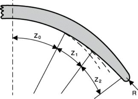 Kontaktlinse 1: Randgestaltung bei dreikurvigen Kontaktlinsen. Z0 Zentralzone, Z1 periphere Zone 1, Z2 Randzone 2, R Rand≈0,03 mm.