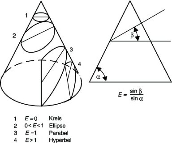 Kontaktlinse 2: Kennzeichnung asphärischer Kontaktlinsenflächen durch die numerische Exzentrizität E. α Neigungswinkel des Kegelmantels, β Winkel zwischen der Schnittebene und der Kegelbasis.