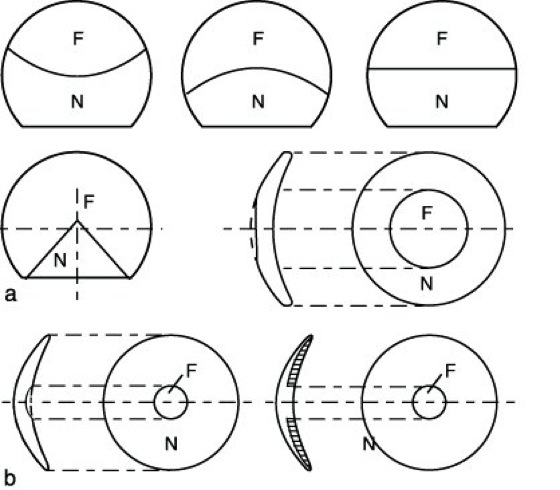 Kontaktlinse 3: a) Bifokal alternierende formstabile Mehrstärken-Kontaktlinsen mit verschiedenen Segmentformen für Ferne (F) und Nähe (N) sowie mit konzentrischen F/N-Zonen; b) simultane Bifokallinsen, formstabil, mit rückseitig angedrehter oder angeschliffener Fern- und Nahzone (links) und mit zwei unterschiedlich brechenden und verschmolzenen Materialien (rechts); c) multifokale Kontaktlinsen mit asphärischer Progressionszone (P) links und Mitte, sowie ringtorisch progressiven Zonen rechts; d) diffraktive Kontaktlinse (Beugungsgitter).