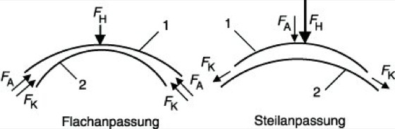 Kontaktlinse 4: Kraftkomponenten bei Flach- und Steilanpassung. 1 Kontaktlinsenrückfläche, 3 Hornhautvorderfläche, FH Haftkraft, FA atmosphärischer Druck bzw. Druckausgleich, FK Kapillarkräfte.