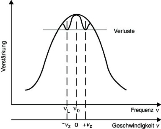 Lamb-dip, eine nach W.E. Lamb, Jr., benannte Einsattelung im Zentrum des Doppler-verbreiterten Verstärkungsprofils von Gaslasern. Der L. tritt auf, wenn die durch die Stöße im Lasermedium bedingte homogene Linienbreite Δνh kleiner als die durch den Doppler-Effekt verursachte Breite ΔνD des Laserüberganges ist. Das Laserfeld der Frequenz νL – das im Laserresonator die Form einer stehenden Welle hat, die man sich wiederum aus zwei in entgegengesetzter Richtung laufenden Wellen zusammengesetzt denken darf – wird im wesentlichen durch die beiden Atomgruppen mit der Geschwindigkeit ±vz in Richtung der Resonatorachse z "gespeist", die sich mit der nach rechts bzw. nach links laufenden Welle in Resonanz befinden (Abb.). Aufgrund der Sättigung im nichtlinearen Laserprozeß werden dabei in die spektrale Verstärkungskurve der Breite ΔνD (Doppler-Profil) zwei Löcher "gebrannt", die symmetrisch zum Zentrum ν0 des Verstärkungsprofils liegen und deren Breite durch die homogene Linienbreite Δνh gegeben ist. Im stationären Laserbetrieb ist dann die Sättigungsverstärkung gleich den Verlusten.