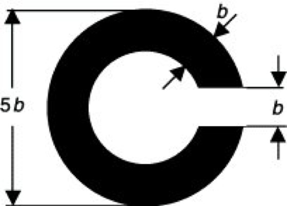Landolt-Ring, Kreisring mit einer Lücke, deren Breite der Strichbreite des Ringes entspricht (Abb.). Der Außendurchmesser des L. beträgt das Fünffache seiner Strichbreite. Der L. ist das Normsehzeichen zur Bestimmung der Sehschärfe. Bei der Sehschärfenbestimmung muß die Lage der Lücke erkannt werden. Die Visusstufe 1 wird erreicht, wenn die Lücke unter einem Sehwinkel von einer Winkelminute und der gesamte Ring unter einem Sehwinkel von 5 Winkelminuten erkannt wird.