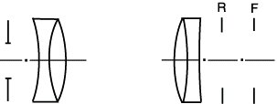 Landschaftslinse: links: Landschaftslinse mit Vorderblende, rechts: das Frontar der Firma Goerz als Beispiel für eine Landschaftslinse mit Hinterblende (R regelbare Irisblende, F feste Blende).
