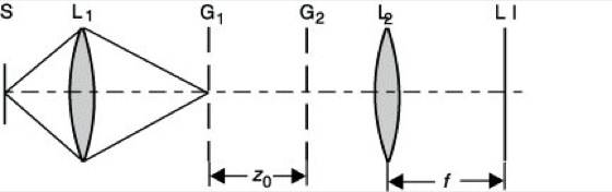 Lau-Effekt: Anordnung zur Erzeugung von Interferenzen nach dem Lau-Effekt. S Lichtquelle; L1, L2 Linsen; G1, G2 Gitter, LI Lau-Interferenzen, f Brennweite.