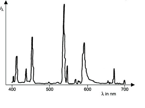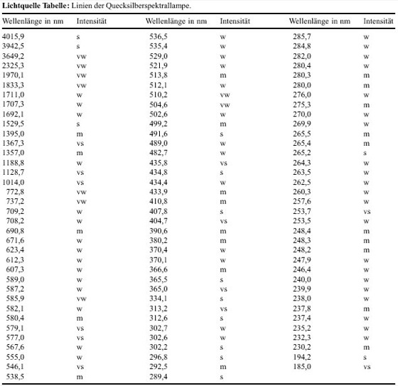 Eine besondere Klasse von Gasentladungslampen sind die Spektrallampen, in der Regel Mitteldruck-Entladungslampen. Sie zeigen je nach Füllung die Spektren von Alkalimetallen (Na, K, Cs), von Edelgasen (Ne, He) sowie der Metalle Quecksilber, Zink, Thallium und Cadmium. Sie werden vornehmlich zur Wellenlängeneichung von Spektralphotometern oder, mit Filtern zusammen, als monochromatische Lichtquellen verwendet. Die Linien der häufig benutzten Quecksilberspektrallampen sind in der Tabelle aufgelistet. Die Intensitäten sind in die Gruppen vs, s, m, w, vw eingeteilt. Dabei bedeutet vs sehr stark (very strong), s stark (strong), m mittel (medium), w schwach (weak) und vw sehr schwach (very weak). Hohlkatodenlampen sind spezielle Spektrallampen für die Atomabsorptions-Spektrometrie. Mit Wasserstoff- oder Deuteriumgas gefüllte Kapillarlampen, kurz Wasserstoff- bzw. Deuteriumlampen genannt, sind Glimmentladungslampen, die neben Linienspektren von