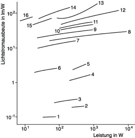 Lichtquelle 1: Lichtstromausbeuten in Relation zur Lampenleistung. 1 Wachskerzen, 2 Gaslicht, 3 Petroleumlampen, 4 Gasglühlicht, 5 Acetylenlampen, 6 Kohlefadenlampen, 7 Wolframglühlampen, 8 Xenon-Hochdrucklampen, 9 Halogen-Glühlampen, 10 Quecksilber-Hochdrucklampen, 11 wie 10 mit Leuchtstoff, 12 Halogen-Metalldampflampen, 13 Natrium-Hochdrucklampen, 14 Natrium-Niederdrucklampen, 15 Leuchtstofflampen, 16 Kompakt-Leuchtstofflampen.