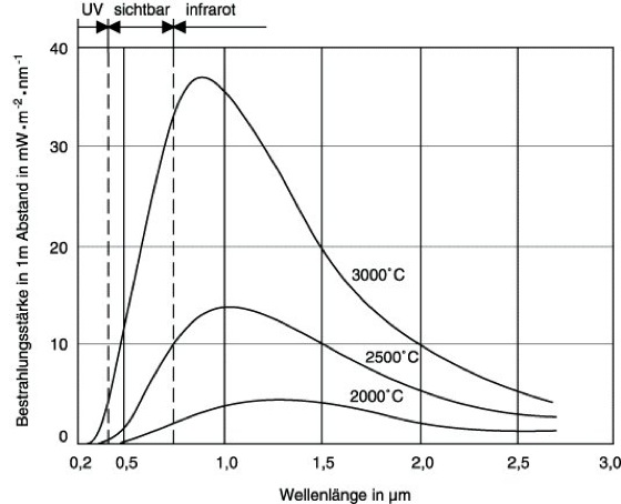 Die spektrale Leistungsverteilung einer Wolframbandlampe bei verschiedenen Temperaturen ist in Abb. 2 dargestellt. Mit zunehmender Temperatur wird die Lichtausbeute im sichtbaren Gebiet größer, allerdings nimmt dabei auch die technische Lebensdauer der Lampe ab. Bei Glühlampen lassen sich Lebensdauern von 2500 Betriebsstunden erreichen, während hochbelastbare Projektionslampen mit großer Lichtausbeute für nur 50 Stunden Brenndauer hergestellt werden. Die Farbtemperaturen für geradfädige Vakuum-Wolframlampen liegen bei 2500 K, während gasgefüllte Wendellampen 2700 bis 3000 K erreichen. Werden dem Füllgas einer Glühlampe Halogenzusätze, z.B. Brom, beigemischt, so verbinden sich die abdampfenden Wolframpartikel an der kälteren Kolbenwand zu einer Wolfram-Halogen-Verbindung. Dieses Wolframhalogenid strömt durch Konvektion unter anderem zum heißen Wolframdraht zurück und zersetzt sich dort wieder zu Wolfram und Halogen. Die besonders heißen, durch Verdampfung im Durchmesser verringerten Wolframdrahtteile werden durch diesen Prozeß wieder verdickt, so daß die Lampe bei höheren Temperaturen (3200 bis 3400 K) mit besserer Lichtausbeute betrieben werden kann. Die Kolbenschwärzung bei Halogenglühlampen ist minimal, die Lampen weisen einen konstanten Lichtstrom bis zum Ende der technischen Lebensdauer auf. Die Lichtstromausbeuten liegen in der Regel oberhalb 20 lm/W (Abb. 1).