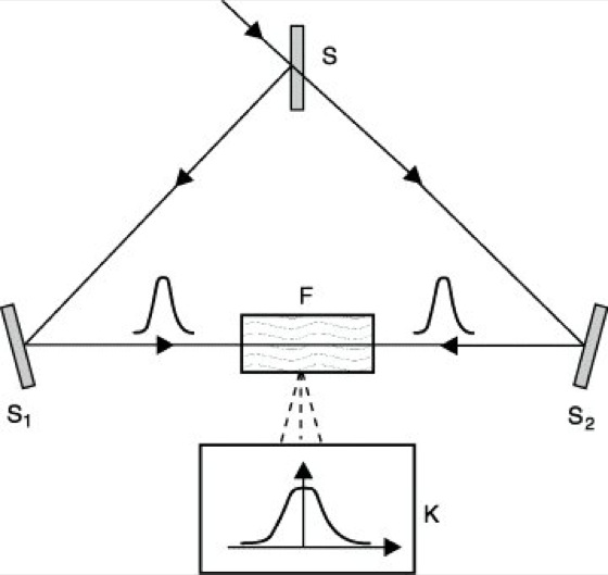Messung ultrakurzer Lichtimpulse 1: Impulsmessung via Zweiphotonenfluoreszenz. S halbdurchlässiger Spiegel; S1, S2 Umlenkspiegel, F fluoreszierende Flüssigkeit, K Kamera.