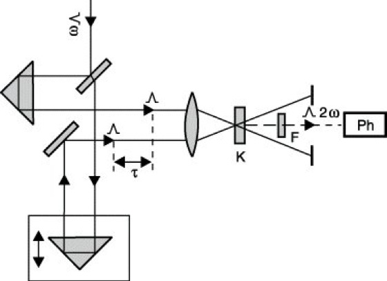 Ein weiterer, zur Impulsmessung geeigneter nichtlinearer optischer Prozeß ist die Frequenzverdopplung. Hierbei wird der ankommende Impuls in zwei Teilimpulse zerlegt, die mit einer wahlweise einstellbaren zeitlichen Verzögerung entweder parallel (kollineare Wechselwirkung) oder unter einem Winkel (nichtkollineare Wechselwirkung) durch einen nichtlinearen Kristall geschickt werden (Abb. 2), wo sie die zweite Harmonische erzeugen (Harmonischenerzeugung). Das zeitliche Integral über deren Intensität ist das Meßsignal, das mit einem Detektor registriert wird. Es wird so die Intensitätskorrelationsfunktion G(2)(τ) für eine feste Verzögerungszeit τ gemessen. Wie im Falle der Zweiphotonenfluoreszenz enthält das Signal zusätzlich einen Untergrund. Dessen Auftreten kann dadurch vermieden werden, daß man bei kollinearer Wechselwirkung die beiden Teilimpulse senkrecht zueinander linear polarisiert und den Kristall und seine Orientierung so wählt, daß nur dann eine Harmonische erzeugt wird, wenn sowohl Strahlung der einen Polarisationsrichtung als auch Strahlung der anderen Polarisationsrichtung gleichzeitig auf den Kristall trifft. Des weiteren läßt sich ein untergrundfreies Signal bei nichtkollinearer Wechselwirkung erhalten. Die Methode der Harmonischenerzeugung hat den Vorteil, daß sich die Verzögerungszeit sehr genau einstellen läßt, so daß Impulsmessungen im Femtosekundenbereich möglich sind. Allerdings muß zur Messung ein Impulszug zur Verfügung stehen, da die Einzelmessung den Wert der Intensitätskorrelationsfunktion für nur einen Wert von τ liefert.