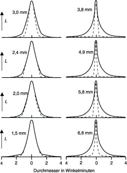 Modulationsübertragungsfunktion 1: Helligkeitsverteilung des Linienbildes (Linienbildfunktion L) des menschlichen Auges mit dem Pupillendurchmesser als Parameter. Die gestrichelten Kurven stellen den beugungsbedingten Anteil dar. Bei kleinen Pupillendurchmessern dominieren die Beugungseinflüsse, während bei größeren die Abbildungsfehler des Auges überwiegen (nach Campbell und Gubisch, J. Physiol. 186, 558, 1966).