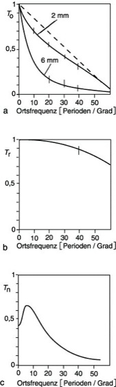 Modulationsübertragungsfunktion 2: Zerlegung der Modulationsübertragungsfunktion des Auges in eine optische Komponente To (a) bei Pupillendurchmessern von 2 bzw. 6 mm, eine retinale Komponente Tr (b) und eine neuronale Komponente Tn (c). Die psychophysische Kontrastempfindlichkeitsfunktion ergibt sich aus der multiplikativen Hintereinanderschaltung der 3 Teilkomponenten (nach Kern, Bildverarbeitung durch das visuelle System, Fachbereich Messen-Steuern-Regeln 8, Springer Verlag, Heidelberg 1982).