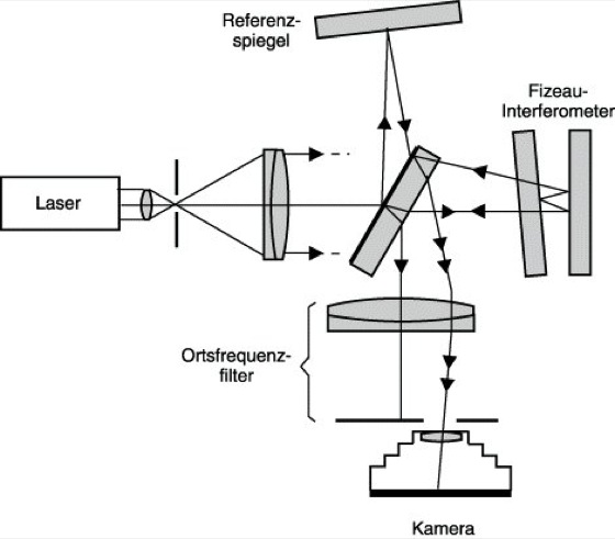 Multipass-Interferometrie, ein interferometrisches Verfahren, bei dem ein Teilstrahl, der den Prüfling N-mal passiert hat oder von seiner Oberfläche N-mal reflektiert wurde, mit einem Referenzstrahl zur Interferenz gebracht wird. Dabei bedeutet N eine große ganze Zahl. Dem Streifenabstande entspricht dann bei Messungen von Höhenprofilen ein Höhenunterschied der Größe λ/(2N), wobei λ die Wellenlänge bezeichnet. Für die M. kann ein Twyman-Green-Interferometer, kombiniert mit einem Vielstrahl-Fizeau-Interferometer, verwendet werden (Abb.). Durch geeignete Wahl des Neigungswinkels im Fizeau-Interferometer, entsprechende Neigung des Referenzspiegels und Ortsfrequenzfilterung wird erreicht, daß nur diejenige Teilwelle, die im Fizeau-Interferometer N-mal hin und hergelaufen ist, mit der Referenzwelle interferiert.