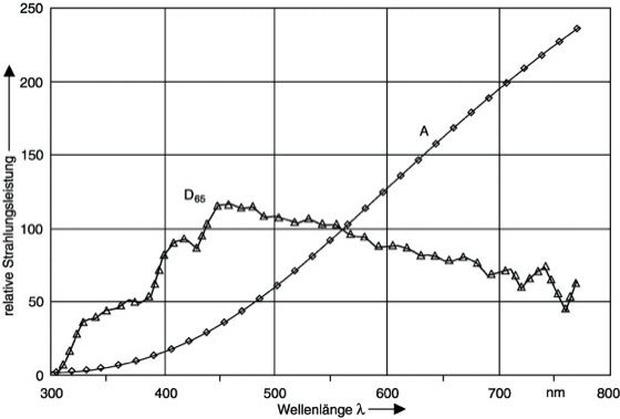 Normlichtart: Strahlungsfunktion für die Normlichtarten A (Glühlampenlicht) und D65 (Tageslicht).