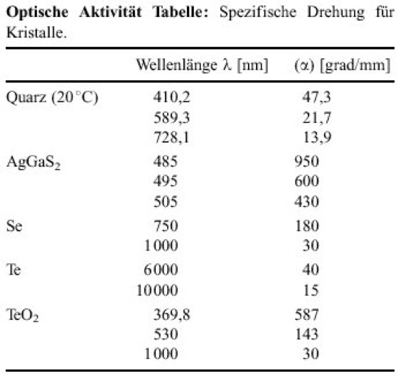 Bei Kristallen wird als spezifische Drehung (α) der Drehwinkel α je mm durchlaufene Kristalldicke definiert. Einige Werte sind in der Tabelle zu finden. Bei reinen Flüssigkeiten wird die spezifische Drehung [α] auf 100 mm Schichtdicke, bei aktiven Lösungen auf 1 g Substanz in 100 ml Lösung und ebenfalls 100 mm Schichtdicke bezogen. Die spezifische Drehung ist also [α]=100 α/(lc) mit α als Drehungswinkel bei einer Schichtdicke l in dm und einer Konzentration c in g/100 ml. Die spezifische Drehung ist im allgemeinen unabhängig von der Konzentration (Biotsches Gesetz), falls keine chemische Reaktion zwischen Lösungsmittel und aktiver Substanz stattfindet.