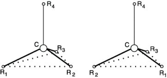 Die Ursache der o. A. liegt bei Kristallen in einer schraubenförmigen Kristallstruktur (Kristallsymmetrien ohne Symmetriezentrum) und bei Flüssigkeiten und Lösungen in einer Schraubenstruktur der Moleküle (ebenfalls ohne Symmetriezentrum) selbst. Eine schraubenförmige Kristallstruktur wurde in der Reuschschen Glimmerkombination, auch Glimmersäule genannt (E. Reusch 1869) durch eine wendeltreppenartige Anordnung von nicht drehenden, aber natürlich doppelbrechenden Glimmerplättchen nachgebildet und damit eine Rotationspolarisation erzeugt. Bei Flüssigkeiten und Lösungen ist nach van't Hoff und le Bel die o. A. an eine asymmetrische Molekülform gebunden. Beispielsweise ist in Abb. 1 ein asymmetrisches Kohlenstoffatom dargestellt, bei dem die nach den Ecken eines regulären Tetraeders gerichteten Valenzen des C-Atoms durch vier verschiedene Atome oder Radikale abgesättigt werden. Da zwei spiegelbildliche Formen des Moleküls existieren, die nicht durch Drehung ineinander überführt werden können (optische Isomerie), wird von beiden Formen eine unterschiedliche Drehung der Polarisationsebene hervorgerufen.