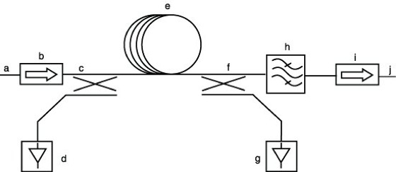 Störungen durch Reflexionen werden mit Hilfe von Faraday-Isolatoren b und i verringert. Ein großer Teil der im Faserverstärker entstehenden spontan emittierten Lichtleistung kann durch ein zusätzliches Bandpaßfilter h unterdrückt werden. Den Ausgang j verläßt dann nur noch das verstärkte Signal.