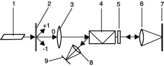 Optische Speicherung 1: Optikschema zum Lesen von Videoplatten. 1 He-Ne-Laser, 2 Gitter, 3 Anpassungsoptik, 4 Wollaston-Prisma, 5 λ/4-Plättchen, 6 Leseobjektiv, 7 Speicherplatte, 8 Zylinderlinse, 9 Empfängerebene.