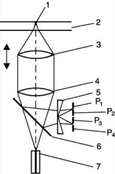 Optische Speicherung 2: Optikschema zum Lesen von Audioplatten. 1 Lesefleck, 2 Schutzschicht auf der Platte, 3 Leseobjektiv, 4 optisches System für die Wandlung des vom Halbleiterlaser abgestrahlten Wellenfeldes in ein ebenes Wellenfeld, 5 Prismen, 6 Teilerspiegel, 7 Halbleiterlaser; P1, P2, P3, P4 Photodioden.