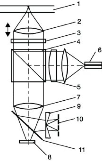 Optische Speicherung 3: Schema des optischen Schreib- und Lesekopfes für das Write-Once-Verfahren. 1 Speicherplatte, 2 Leseobjektiv, 3 λ/4-Plättchen, 4 polarisationsabhängiger Strahlteiler, 5 Zylinderlinse, 6 Halbleiterlaser, 7 abbildendes optisches System, 8 Empfänger für die radiale Spurkontrolle, 9 Prismen, 10 Empfänger für die Signalgewinnung und die Fokuskontrolle, 11 Teilerspiegel.