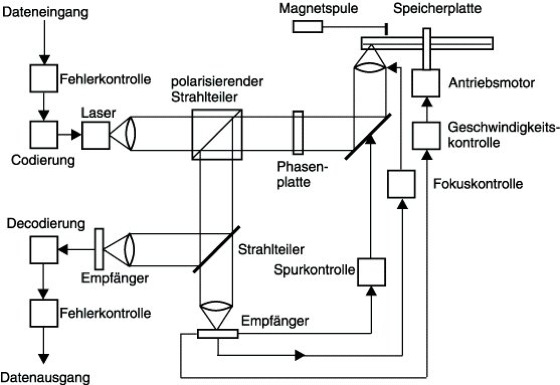 Eine wichtige Komponente der Gerätesysteme für die digitale o. S. ist die Lichtquelle, für welche in erster Linie Halbleiterlaser genutzt werden. Bewährt haben sich sogenannte Doppelheterostrukturlaser (Mehrfachheterostrukturlaser) mit einer Schichtstruktur von (Ga,Al)As auf GaAs. Die Wellenlänge des emittierten Laserlichtes liegt bei 0,78 μm. Wünschenswert wäre eine kürzere Wellenlänge, da sich damit der Durchmesser des Lesefleckes verringern und so die Speicherdichte vergrößern ließe. Bei den zum Schreiben und zum Lesen genutzten Objektiven handelt es sich um beugungsbegrenzte Mikroobjektive mit einer sehr geringen Masse (bis herab zu etwa 0,6 g). Sie müssen zur Korrektur der Fokussierung mittels einer Tauchspule sehr schnell bewegt werden, wobei sie Beschleunigungen von mehr als 10g (g Erdbeschleunigung) erfahren. Das Schema des sowohl zum Einschreiben als auch zum Lesen benutzten optischen Systems ist in Abb. 3 dargestellt. Sein Aufbau entspricht weitgehend einer Kombination der in Abb. 1 und 2 erläuterten optischen Systeme für das Read-Only-Verfahren. Auch die Spurkontrolle erfolgt nach dem gleichen Prinzip, wobei sich das optische System an einer verspiegelten Rille orientiert.