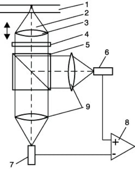 Optische Speicherung 5: Schema für die Signalgewinnung mittels des polaren Kerr-Effekts. 1 optische Speicherplatte, 2 reflektiertes Licht, 3 Mikroobjektiv, 4 Phasenplatte, 5 polarisationsabhängiger Strahlteiler; 6, 7 Empfänger, 8 Differenzverstärker, 9 abbildende optische Systeme.