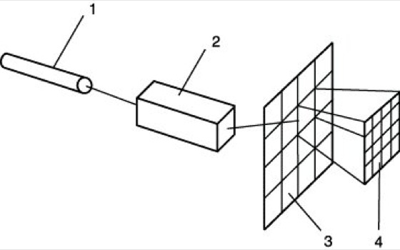 Optische Speicherung 6: Anordnung zum Einschreiben eines Hologramms für die Datenspeicherung. 1 Datenvorlage, 2 Hologrammplatte, 3 Referenzwelle, 4 sphärische Welle.
