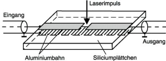 optoelektronischer Schalter, ein in seiner Wirkungsweise dem optischen Tor ähnelndes Bauelement, mit dem jedoch nicht Licht, sondern elektrische Spannungen oder Mikrowellen geschaltet werden. Dabei werden die kürzesten elektronischen Schaltzeiten erreicht. Der erste o. S. wurde 1975 von D.H. Auston entwickelt. Er besteht aus einem Plättchen aus hochohmigem Silicium, das auf der Ober- und Unterseite mit Leiterstreifen aus Aluminium bedampft wurde, wobei die obere Leiterbahn durch einen schmalen Spalt unterbrochen ist (Abb.). Auf letzteren wird ein ultrakurzer Lichtimpuls der Wellenlänge λ=0,53 μm (2. Harmonische eines Neodymglaslasers) fokussiert. Dieser Impuls erfährt im Silicium eine starke Absorption. Er dringt daher nur in eine oberflächennahe Schicht ein und erzeugt dort eine große Zahl von Elektronen-Loch-Paaren. Dadurch wird über den Spalt hinweg kurzzeitig eine gute leitende Verbindung hergestellt. An die beiden Enden des Streifenleiters ist jeweils ein Koaxialkabel angeschlossen. Liegt am Eingangskabel eine Gleichspannung an, so wird diese also auf das Ausgangskabel übertragen, solange die erzeugte Photoleitfähigkeit besteht. Das betreffende Zeitintervall ist durch die Dauer des optischen Impulses, zuzüglich der Relaxationszeit für die Rekombination der Ladungsträger, gegeben. Da diese Relaxationszeit im Falle von kristallinem Silicium relativ groß ist (länger als 1 ns), verwendete Auston einen zweiten Laserimpuls der Wellenlänge λ=1,06 μm (Ausgangsstrahlung des Neodymglaslasers) zum Ausschalten. Dieser Impuls dringt, im Gegensatz zum ersten, tief in das Silicium ein und erzeugt dabei über die gesamte Plattendicke bis zum unteren Leiterstreifen hin Elektronen-Loch-Paare. Dadurch wird ein Kurzschluß zwischen dem oberen und dem unteren Leiterstreifen bewirkt, was die Unterbrechung der Verbindung zum Ausgangskabel zur Folge hat.