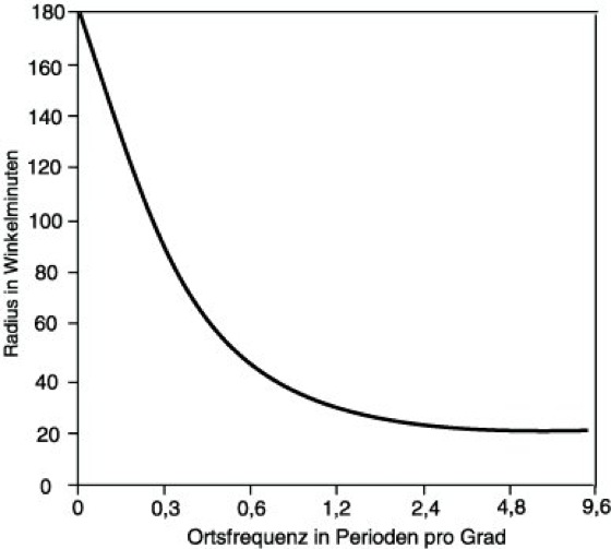 Während bei höheren Ortsfrequenzen zeitliche Modulationen kaum Einfluß auf die Ausdehnung der P. haben, ist eine Abhängigkeit der P. von zeitlichen Fluktuationen bei niedrigen Ortsfrequenzen festzustellen. So nimmt für Stimuli mit Ortsfrequenzen von 0,125 Perioden pro Grad die horizontale Ausdehnung der P. von rund 20 Winkelminuten bei einer zeitlichen Frequenz von 0,1 Hz auf rund 6 Winkelminuten ab, wenn der Stimulus mit einer zeitlichen Frequenz von 5 Hz dargeboten wird. Im Falle eines Reizes von 1 Periode pro Grad dagegen bleibt die horizontale Ausdehnung der P. konstant, unabhängig von der zeitlichen Frequenz, mit der der Stimulus dargeboten wird.