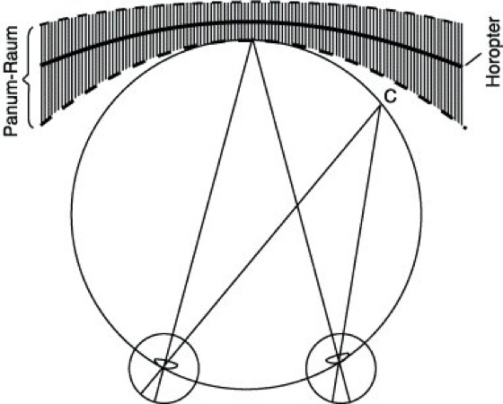 Panum-Raum: Panum-Raum und Horopter. Der Punkt C liegt außerhalb des Panum-Raumes und wird daher doppelt gesehen (nach von Camphausen, Die Sinne des Menschen, Thieme-Verlag, Stuttgart 1982).