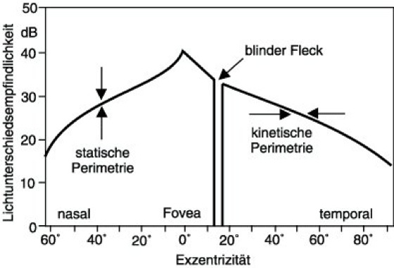 a) Bei der statischen P. wird an einem festen Netzhautorte die Helligkeit des Prüfpunktes verändert, so daß die LUE quantitativ ermittelt werden kann (Abb.). Die statische P. ist automatisierbar, so daß sie weitgehend vom Untersucher unabhängig ist. Ihr großer Vorteil besteht darin, daß das Gesichtsfeld durch Angabe von Zahlenwerten darstellbar ist. Sie weist eine sehr hohe Sensitivität auf, d.h., es werden mit sehr großer Wahrscheinlichkeit Auffälligkeiten des Gesichtsfeldes mit diesem Verfahren entdeckt. Andererseits ist das Verfahren so empfindlich, daß individuelle Varianten des Gesichtsfeldes ermittelt werden können, die nicht notwendigerweise pathologischen Ursprunges sein müssen.