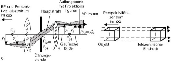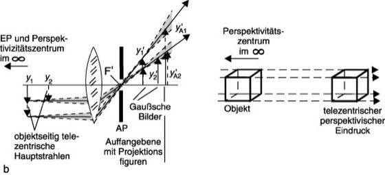 Bei visuellen optischen Instrumenten wird das Perspektivitätszentrum in die Eintrittspupille (Blende) abgebildet, die auch bei objektiven optischen Instrumenten das Perspektivitätszentrum ist, dessen Lage gegenüber dem abzubildenden Objekt die P. bestimmt (Abb. 2). Bei der entozentrischen P. (Abb. 2a) liegt wie beim normalen Sehen das Perspektivitätszentrum hinter dem Objekt, so daß eine perspektivische Verkürzung entfernter Objektlängen auftritt. Telezentrische P. (Parallelperspektive) mit im Unendlichen liegendem Perspektivitätszentrum liegt bei objekt- bzw. beiderseitig telezentrischem Hauptstrahlengang vor (Abb. 2b und c). Bei dieser beim Mikroskop und bei optischen Meßinstrumenten verwendeten P. werden alle Strecken unverkürzt, maßstabsgerecht abgebildet. Verlagert das optische System, wie z.B. bei der Betrachtung durch eine Lupe (Abb. 2d) das Perspektivitätszentrum vor das Objekt, erhält man hyperzentrische P., bei der sich nur die rückwärtigen Verlängerungen der Hauptstrahlen im Perspektivitätszentrum schneiden. Bei dieser unnatürlichen P. erscheinen entferntere Objekte größer als nähere. Ebenfalls unnatürlich infolge Vertauschung von Vorder- und Hintergrund ist die pseudoskopische P. des mit der konjugierten Welle rekonstruierten reellen Bildes bei der Fresnel-Holographie (Abb. 3).