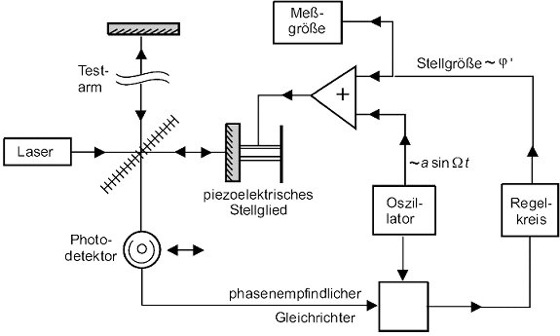Die Abb. zeigt eine Prinzipschaltung für ein Michelson-Interferometer. Das Stellglied ist eine piezoelektrische Keramik, die allerdings nur einen kleinen Phasenhub erlaubt, weshalb elektronische Sonderlösungen bei größeren Phasenvariationen nötig sind. In einem solchen Falle müssen elektronisch die mod2π-Sprünge gezählt und vorzeichenrichtig gespeichert werden, um den tatsächlichen Phasenwert zu berechnen.