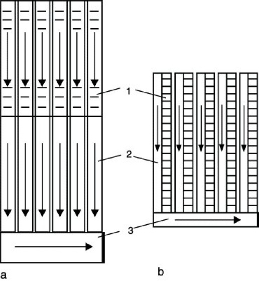 Aufbau und Wirkungsweise. Aufbau und Wirkungsweise sind am Beispiel des CCD-P. erläutert (Abb. 1). Auf einem Substrat aus p-Silicium befinden sich, durch eine dünne SiO2-Schicht von der Unterlage isoliert, streifenförmige parallele Metallelektroden, deren jeweils dritte miteinander verbunden sind. Wird eine positive Spannung U1, U2 oder U3 angelegt, so bildet sich nahe der Si-Oberfläche eine an e+-Ladungen (Majoritätsträger) verarmte Schicht aus, in welcher photoelektrisch erzeugte e--Ladungen (Minoritätsträger) für eine gewisse Zeit gespeichert und "paketweise" von Elektrode zu Elektrode verschoben werden können, wenn die Spannung in zyklischer Folge variiert wird. Das elektronische Bild verschiebt sich so als Ganzes. Jeder Elektrode ist beim P. ein lichtelektrisch empfindlicher Sensorbereich (Bildpunkt, engl. pixel) zugeordnet. Im Falle einer Zeile ergibt sich über einen abschließenden Verstärker unmittelbar eine zeitliche Signalfolge (Videosignal), im Falle einer Matrix wird das Videosignal erst nach Übertragung des elektronischen Bildes entweder in ein neben dem Sensorarray liegenden Speicherfeld (engl. frame transfer) oder in jeweils zwischen den Sensorspalten liegende Schieberegister (engl. interline transfer) gewonnen (Abb. 2). Die Taktfrequenz, bezogen auf den einzelnen Bildpunkt, beträgt 5 bis mehr als 20 MHz. Während CCD-P. seriell ausgelesen werden, sind CID-P. x,y-adressierbar.