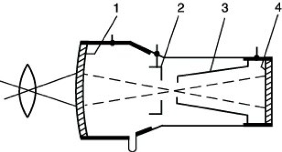 Photoelektrischer Bildverstärker 1: Einfacher Bildwandler, elektrostatisch fokussiert. 1 Photokatode, 2 Linsenelektrode, 3 Anode, 4 Leuchtschirm.