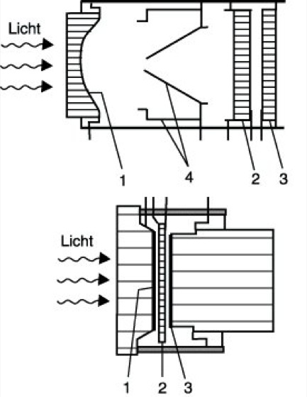 Photoelektrischer Bildverstärker 2: Bildverstärker der 2. und 3. Generation. 1 Photokatode auf Faseroptikplatte, 2 Mikrokanalplatte, 3 Leuchtschirm auf Faseroptikplatte, 4 elektrostatische Fokussierelektrode.