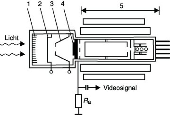 Photoelektrischer Bildverstärker 3: SIT-Vidikon. 1 Eintrittsfenster (Faseroptikplatte) mit Photokatode, 2 Beschleunigungselektrode (Gate), 3 Fokussierelektrode, 4 Si-Multidiodentarget, 5 Vidikon, Ra Arbeitswiderstand.