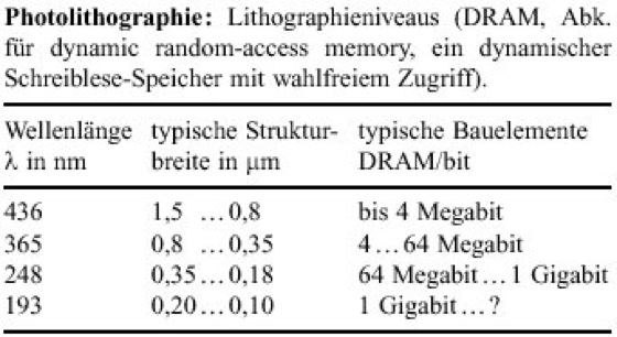 3) Belichtungsgeräte und Verfahren für die Photolithographie. Deren Einteilung kann nach unterschiedlichen Kriterien erfolgen. Hinsichtlich der zur Abbildung genutzten Strahlung ist zunächst zwischen polychromatischer und monochromatischer Abbildung zu unterscheiden. Um den Aufwand zur chromatischen Korrektur der Linsen zu verringern, werden in den neueren Hochleistungsgeräten nur monochromatische Verfahren genutzt. Als Lichtquellen kommen insbesondere Quecksilber-Hochdruck-Entladungslampen in Frage. Die zur Abbildung ausgefilterte Quecksilberlinie wird zur Bezeichnung der Lithographie verwendet (g-Linie bei der Wellenlänge 436 nm, i-Linie bei 365 nm). Verkleinerung der Wellenlänge bedeutet Verringerung der realisierbaren Strukturbreiten und Erhöhung der Speicherdichte, d.h., auf der gleichen Siliciumfläche können mehr Bauelemente untergebracht werden (Tab.). Obwohl der Aufwand steigt, sinken durch die bessere Flächenausnutzung die Herstellungskosten pro Bauelement.