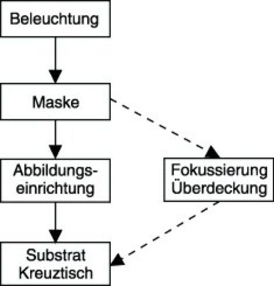 1) Das Grundprinzip der Photolithographie. Durch die Beleuchtungseinrichtung (Lichtquelle und Kondensor) wird eine gleichmäßige Ausleuchtung der Maske erreicht (Abb. 1). Die in der Maske in Form von Transparenz- und/oder Phasenunterschieden gespeicherte Information wird durch die Abbildungseinrichtung in die auf das zu strukturierende Substrat aufgebrachte Photoresistschicht übertragen. In dieser entstehen dabei Löslichkeitsunterschiede. Bei der Entwicklung der Photoresistschicht werden die Gebiete mit größerer Löslichkeit herausgelöst, so daß auf dem Substrat ein der Maske entsprechendes Resistrelief entsteht (Abb. 2). Wird durch die Lichteinwirkung die Löslichkeit erhöht, spricht man von Positivverfahren, andernfalls, wenn die Löslichkeit verringert wird, von Negativverfahren. Das Substrat kann durch Verschieben des Tisches (in x- und y-Richtung sowie Winkelkorrektur) zur Maske justiert werden, so daß die Abbildung paßgenau zu bereits auf dem Substrat befindlichen Strukturen erfolgen kann. Um die Resistschicht optimal in die Bildebene zu bringen, ist zusätzlich eine Verschiebung des Tisches in z-Richtung erforderlich (Fokussierung).