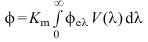 1) Lichtstrom (φ, φv). Darunter versteht man die aus der Strahlungsleistung φe einer Lichtquelle durch die Bewertung gemäß der V(λ)-Kurve hervorgehende Größe ![]()
