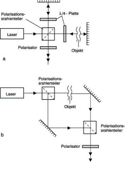 Durch die Kombination zweier Savartscher Doppelplatten o.ä. können auch kompensierte Interferometer – selbst mit getrennten Strahlengängen – aufgebaut werden, die bei Benutzung von inkohärenten Lichtquellen höhere Lichtstärken ermöglichen. Auch Polarisationsstrahlenteiler können zum Aufbau von Michelson- bzw. Mach-Zehnder-Interferometern verwendet werden (Abb. 3). Die Lichtwellen in den beiden Strahlengängen sind dann senkrecht zueinander polarisiert. Dieser Interferometertyp bietet gegenüber den üblichen Interferometern folgende Vorteile: Es ist eine Einstellung des Kontrastes möglich, die Abkoppelung vom Laser ist gegeben, und man erreicht größere Lichtstärken. Diese Form des P. ist besonders geeignet für die Heterodyn-Interferometrie.