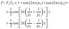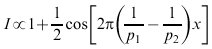 Durch optische Filterung, z.B. unscharfe Abbildung, werden die Anteile mit den hohen Ortsfrequenzen unterdrückt, so daß schließlich ein niederfrequentes Moiré-Bild mit dem Intensitätsverlauf![]()