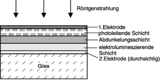 Röntgenstrahlbildwandler, Gerät zur Sichtbarmachung eines von Röntgenstrahlen erzeugten Bildes. Ein R. ist aus unterschiedlichen Schichten aufgebaut (Abb.). An die beiden Elektroden wird eine Wechselspannung angelegt. Sobald Röntgenstrahlung durch die erste Elektrode hindurch auf die photoleitende Schicht trifft, wird diese leitend. Damit liegt die Wechselspannung an der elektrolumineszierenden Schicht, die so zum Leuchten gebracht wird (Elektrolumineszenz). Die Abdunkelungsschicht dient dazu, Fremdlicht von der photoleitenden Schicht fernzuhalten.