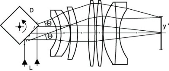 Scanning-Objektiv: Scanning-Objektiv mit bildseitig telezentrischem Strahlengang. L einfallendes Parallellichtbündel, D Drehprisma, θ Ablenkwinkel, y' Auslenkung des Bildpunktes in der Bildebene.