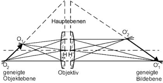 Scheimpflug-Bedingung, auf eine Patentschrift des österreichischen Kartographen Th. Scheimpflug (1904) zurückgehende Bedingung für die scharfe Abbildung einer geneigten Objektebene. Sie erfordert, daß die Bildebene so geneigt wird, daß deren Schnittgerade mit der bildseitigen Hauptebene im gleichen Abstand von der optischen Achse verläuft wie die Schnittgerade zwischen der Objektebene und der objektseitigen Hauptebene (Abb.). Dies bedeutet, daß sich Objekt-, Objektiv- und Bildebene näherungsweise in einer Geraden schneiden müssen. Bei photogrammetrischen Entzerrungsgeräten sorgt eine Carpentier-Steuerung automatisch durch Schwenkung der Objekt-, Objektiv- und Bildebene um eine derartige gemeinsame Achse für die Erfüllung der S.