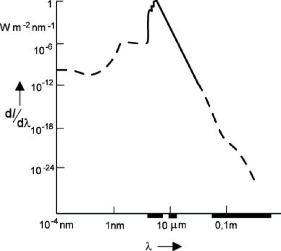 Sonnenspektrum 1: Extraterrestrisches Sonnenspektrum. Im gestrichelten Kurventeil kann die Sonnenstrahlung stark schwanken; den Erdboden erreichen nur Strahlungsanteile in einigen Wellenlängengebieten (dick markierte Striche auf der Abszisse). λ Wellenlänge.