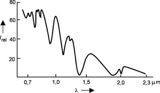 Sonnenspektrum, die spektrale Verteilung der Sonnenstrahlung. Es ist zu unterscheiden zwischen dem extraterrestrischen und dem durch die Erdatmosphäre beeinflußten terrestrischen S. Die Maximalwerte der spektralen Dichte der Intensität Iλ der extraterrestrischen Sonnenstrahlung liegen im sichtbaren Wellenlängengebiet zwischen 460 und 500 nm und betragen etwa 2,2 W m-2 nm-1. 97% der Intensität der extraterrestrischen Sonnenstrahlung fallen in den Spektralbereich zwischen 280 nm und 3 μm. Das extraterrestrische S. ist in doppeltlogarithmischem Maßstab in Abb. 1 wiedergegeben. Im Wellenlängenbereich zwischen 140 nm und 1 mm ist die extraterrestrische Sonnenstrahlung, bezogen auf die mittlere Entfernung Sonne – Erde, zeitlich konstant (durchgezogener Kurventeil). Im restlichen Spektrum können die spektralen Leistungswerte, je nach Sonnenaktivität, um viele Größenordnungen kurzzeitig ansteigen. Bemerkenswert sind im S. die relativ hohe Intensität im Bereich der Lyman-Alpha-Wasserstofflinie bei 121,5 nm und die in Abb. 1 nur andeutungsweise im Maximum erkennbaren Fraunhoferschen Absorptionslinien. Das terrestrische Sonnenspektrum ist gegenüber dem extraterrestrischen infolge der Extinktion der atmosphärischen Gase und Dämpfe modifiziert. Einen Ausschnitt aus dem terrestrischen S. im nahen Infrarot-Gebiet zeigt Abb. 2. Die Absorption ist in diesem Spektralbereich vorwiegend durch atmosphärischen Wasserstoff bedingt. Im ultravioletten Spektralbereich (Wellenlängen unter 330 nm) wird die Sonnenstrahlung in der Atmosphäre stark durch Ozon, Sauerstoff und Stickstoff absorbiert, im mittleren Infrarot-Bereich durch Kohlendioxid, Wasserdampf und Ozon. Am Erdboden kann daher die Sonnenstrahlung nur in bestimmten "atmosphärischen Fenstern" – in Abb. 1 auf der Abszisse markiert – empfangen werden. Aus den Messungen des extraterrestrischen S. kann keine einheitliche Sonnentemperatur abgeleitet werden. Je nach Spektralbereich variieren die Temperaturen. Beispielsweise beträgt die Temperatur, bezogen auf die Temperatur eines schwarzen Körpers, im Sichtbaren etwa 6000 K, bei der Wellenlänge 150 μm etwa 4400 K und im Ultrakurzwellenbereich ungefähr 106 K.