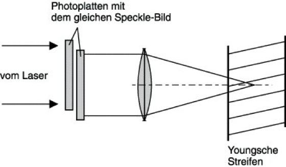 Speckle-Korrelationstechniken (Speckle-Photographie). Zwei gleiche, auf je einer Photoplatte aufgenommene, gegeneinander ein wenig verschobene Speckle-Bilder werden von Laserlicht durchstrahlt (Abb. 2). Mit einer Linse wird das räumliche Fourier-Spektrum (Beugungsbild) erzeugt. Dieses enthält Youngsche Interferenzstreifen, deren Abstand umgekehrt proportional zur Größe der Verschiebung ist und die senkrecht zu der Verschiebungsrichtung liegen. Die Zweiplattenmethode läßt sich auch in eine Doppelbelichtungstechnik umwandeln, wobei die Photoplatte zwischen der ersten und der zweiten Exposition verschoben wird. Die Youngschen Streifen zeigen an, daß die beiden Speckle-Bilder miteinander korreliert sind. Sie treten nicht auf, wenn keine Korrelationen bestehen. Auf diesem Umstande beruht die folgende Speckle-Korrelationstechnik: Eine nach der Doppelbelichtungstechnik hergestellte Aufnahme zweier etwas unterschiedlicher Speckle-Verteilungen (oder die entsprechende Kombination zweier Photoplatten) wird in einem optischen System auf eine Auffangebene abgebildet (Abb. 3). In der Fokalebene der Linse L1 ist eine Doppelschlitzblende so angeordnet, daß die Mitten der Schlitze mit den Minima der beiden Youngschen Streifen der ersten Beugungsordnung zusammenfallen. Das mit der Linse L2 erzeugte Bild ist dann von dunklen Streifen, den Korrelationsstreifen, durchzogen, welche die Stellen anzeigen, an denen die beiden Speckle-Muster miteinander korreliert sind.